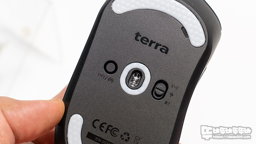 바닥면에는 DPI 변경 버튼 겸 블루투스 페어링 기능하는 버튼과 2.4GHz / 유선 / 블루투스 3 모드 연결을 선택하는 셀렉트 스위치로 구성되어 있습니다.