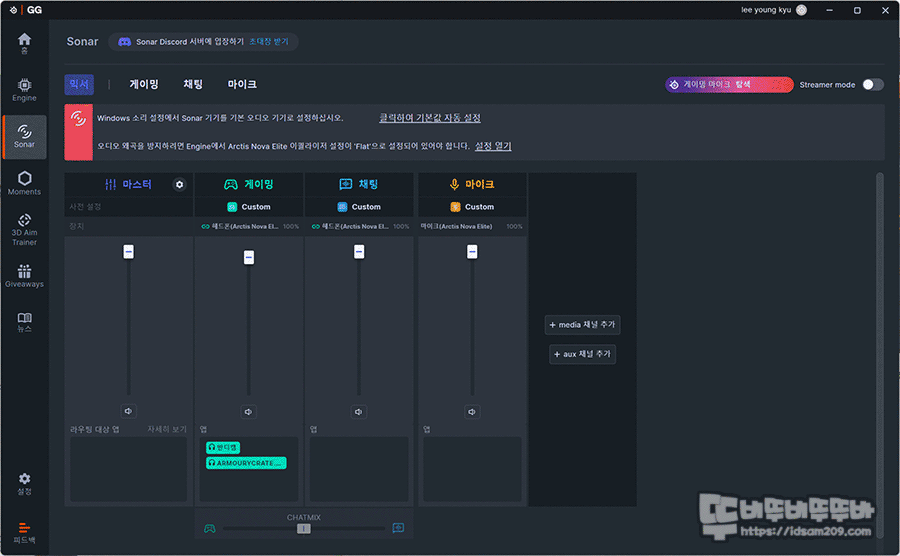 Steelseries GG는 하드웨어 기능을 담당하는 엔진과 소나 사운드, 캐처와 편집을 지원하는 모멘드, 게임 타겟팅 트레인을 할 수 있는 3D 에임 트레이너, 기브어웨이즈, 소프트웨어 설정으로 구분되어 있고요.