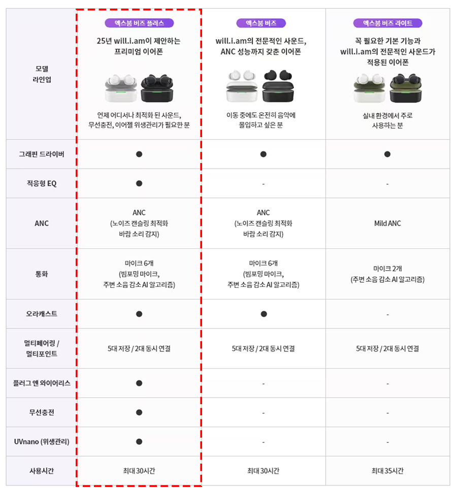 엑스붐 버즈 시리지의 최상이 모델인 플러스는 끝판왕답게 그래핀 드라이버 적용, 적응형 EQ, 플러그 앤 와이어리스, UVnano 살균 기능을 지원하며 버즈 시리즈는 블랙 아이스 피스의 리더인 will.i.am이 전문적이고 섬세한 사운드 튜닝으로 따뜻한 톤의 균형을 선보이고 있는데요.