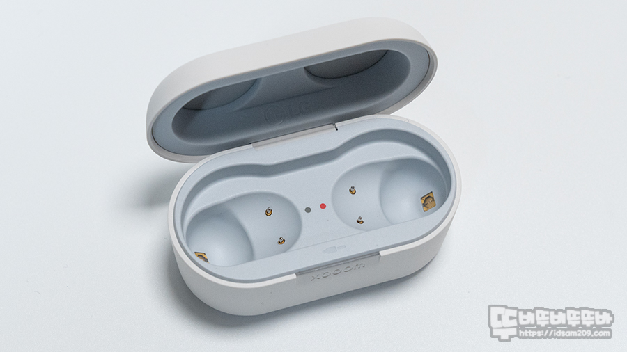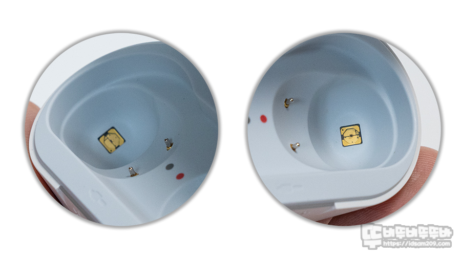 충전 케이스 내부는 왼쪽(그레이), 오른쪽(레드) 도트로 무선 이어버드를 구분하는 표시가 되어 있으며 안쪽에는 버즈 플러스에서만 지원하는 UVnano 살균 기능을 담당하는 램프가 눈에 띄네요.