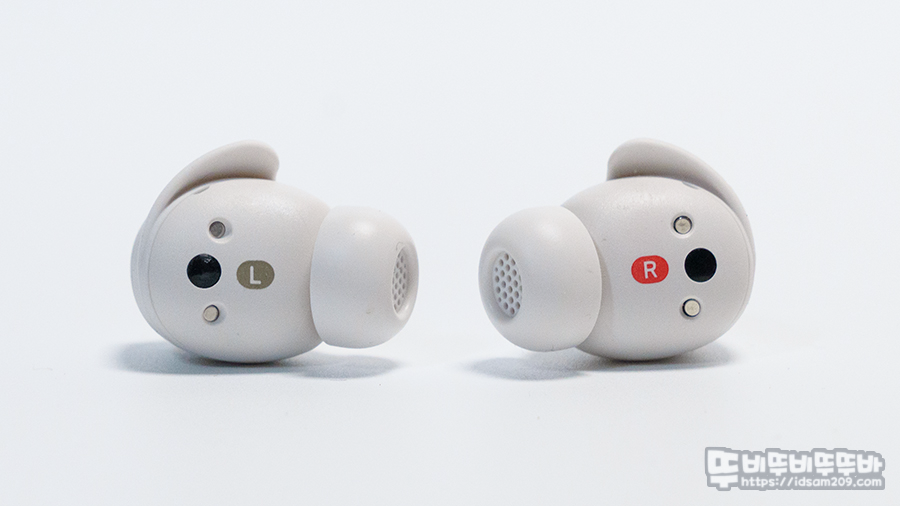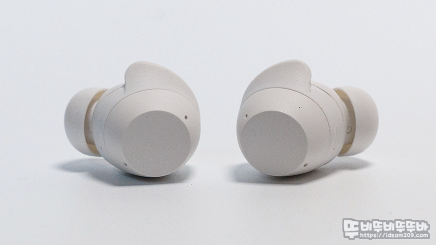 외부에 노출되는 2개의 빔 포밍 마이크는 이어 마이크 사용 시 주변 소음을 줄여주면서 음성을 집중하지만 아무래도 이어버드 바깥쪽에 위치하고 있어서 외부 소음이 심한 곳에서는 음성 통화 시 정확한 음성 전달이 취약할 수 있습니다.