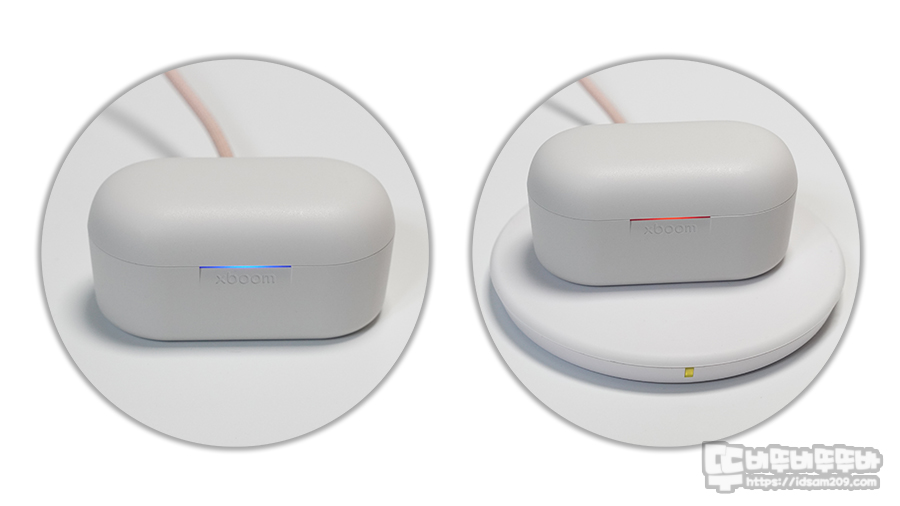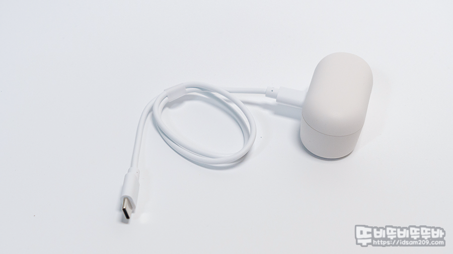 충전 케이스는 캡슐 디자인의 심플한 구조로 USB-C 충전 단자와 전면에 LED 인디케이터가 위치하고 있으며 별도 표기는 없지만 무선 충전도 지원합니다.