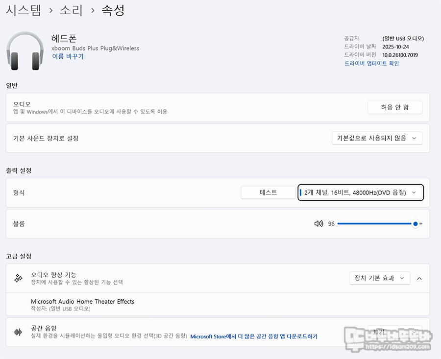 PC에 연결하여 확인해 보니 16비트 48kHz 출력을 지원하는 외장 사운드로 인식하는 것을 확인할 수 있었습니다.