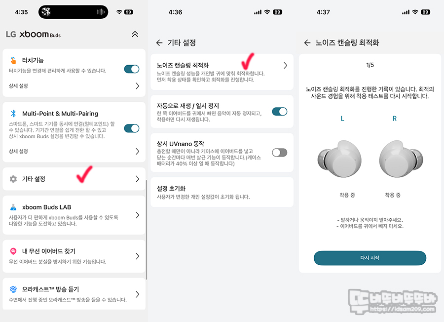기타 설정에서는 노이즈 캔슬링 최적화 기능을 제공하여 5단계의 설정을 거치면 사용자에 커스터마이징 된 노이즈 캔슬링 기능을 제공합니다.