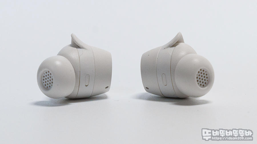 외부에 노출되는 2개의 빔 포밍 마이크는 이어 마이크 사용 시 주변 소음을 줄여주면서 음성을 집중하지만 아무래도 이어버드 바깥쪽에 위치하고 있어서 외부 소음이 심한 곳에서는 음성 통화 시 정확한 음성 전달이 취약할 수 있습니다.