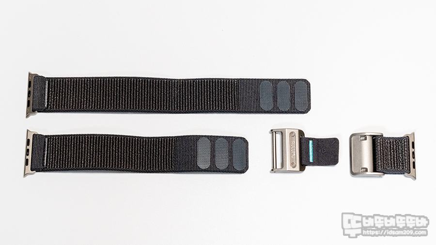후크앤루프 클로저 + 마그넷 버클로 구성된 긴 스트랩과 짧은 스트랩 모습.