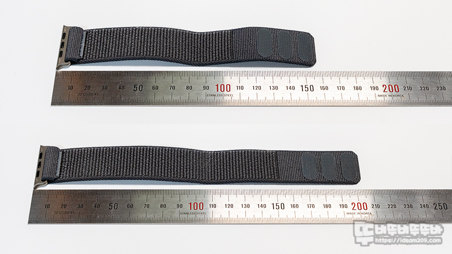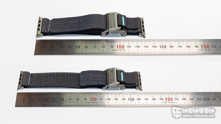기본으로 제공되는 스트랩은 짧은 쪽을 펼치면 약 155mm, 긴 쪽은 약 205mm로 차이가 있고요.