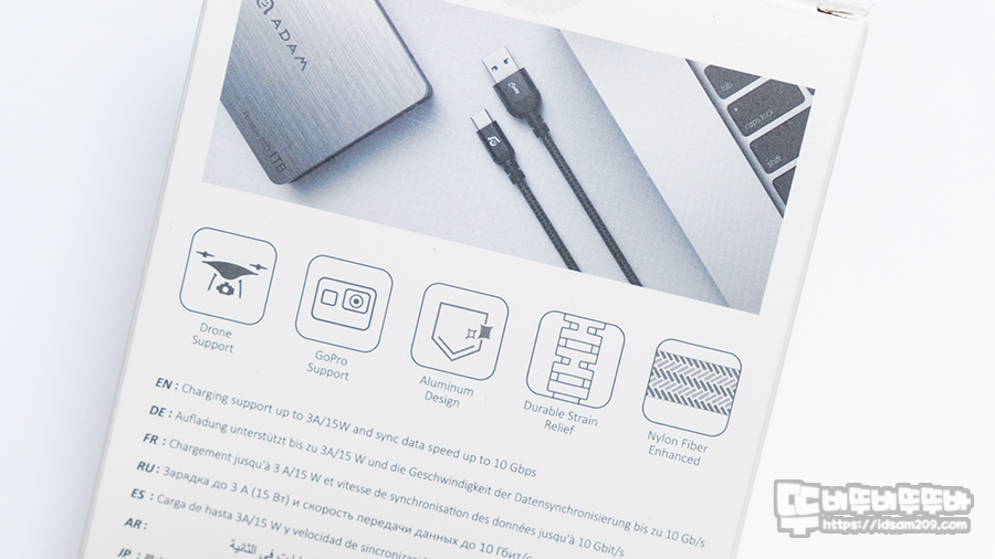 패키지 뒷면의 인쇄 내용을 살펴보면 드론 및 액션 캠류 지원, 알루미늄 디자인, 단선 방지 설계 적용, 고밀도 나일론 직조 케이블 사용 등을 살펴볼 수 있습니다.
