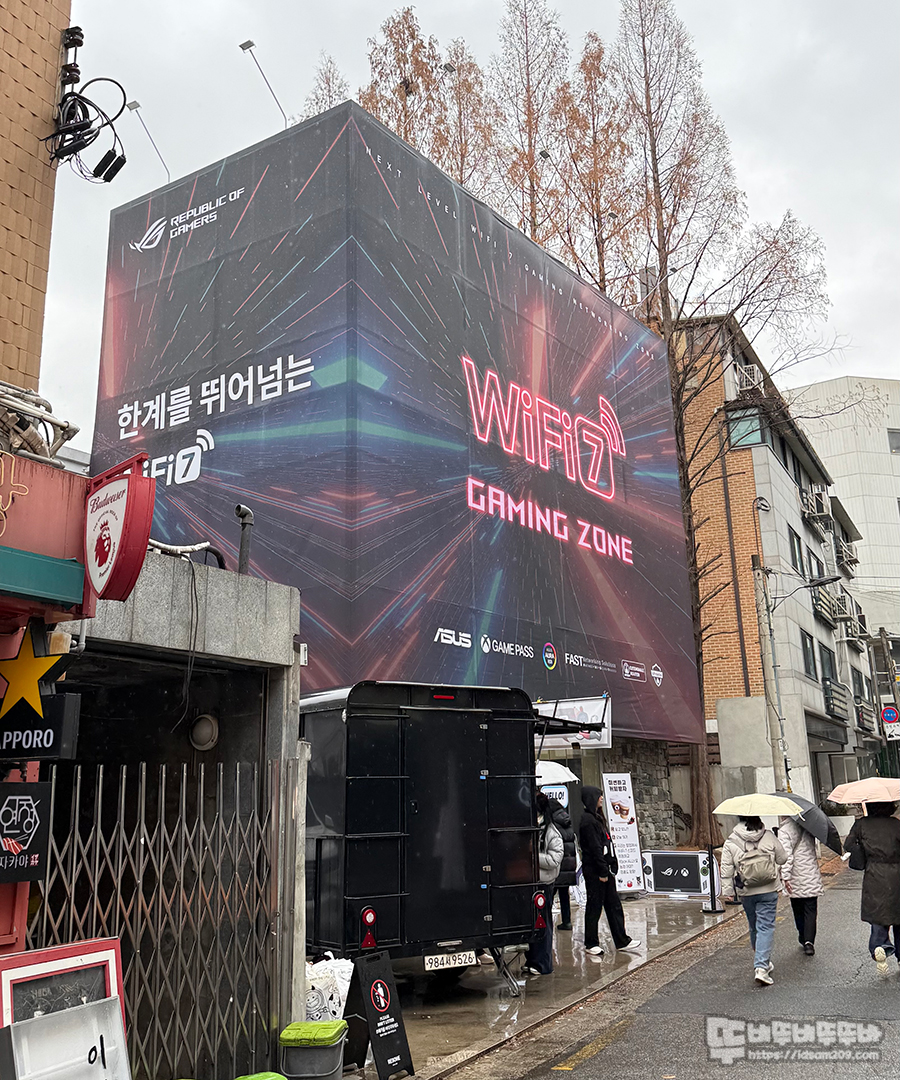 큰길을 지나가다가 골목을 빼꼼히 보면 건물을 감싸는 ASUS ROG 로고와 WiFi 7 Gaming Zone 이미지를 확인할 수 있어 "오~ 여기구나 하고 알 수 있네요."