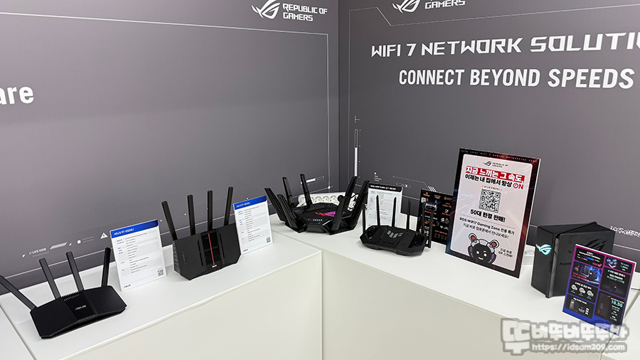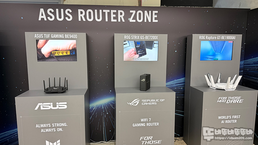 벽을 타고 이동하다 보니 안쪽에 ASUS 라우터 존으로 구분된 최신 Wi-Fi 7 공유기 3종이 전시되어 있었습니다