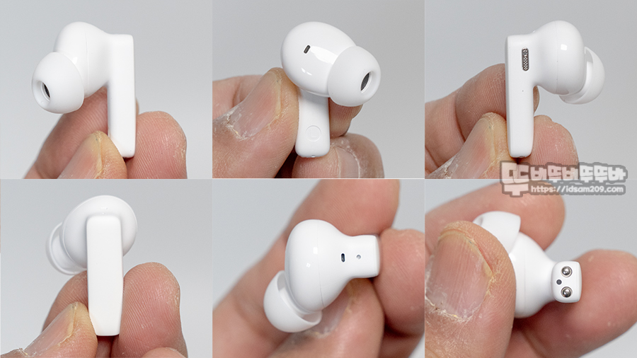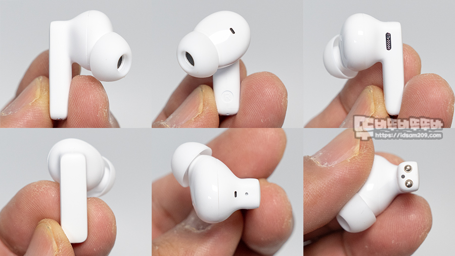 무선 이어버드는 이어버드 안쪽과 위쪽에 노이즈 캔슬링용 마이크를 그리고 위쪽에 추가로 LED 인디케이터 보습을 확인할 수 있고요.