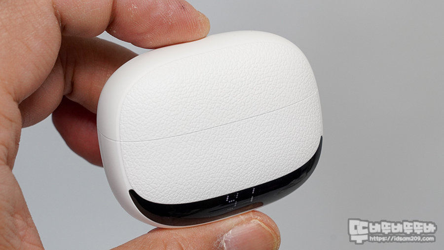 조약돌 느낌의 무선 충전 케이스는 전면과 후면에 레더 패턴이 적용되어 혹시 가죽 아니야? 할 정도의 고급스러움이 느껴지며 하단에 LED 디스플레이를 통해 %로 표기되는 배터리 잔량을 쉽게 확인할 수 있어 좋았습니다.