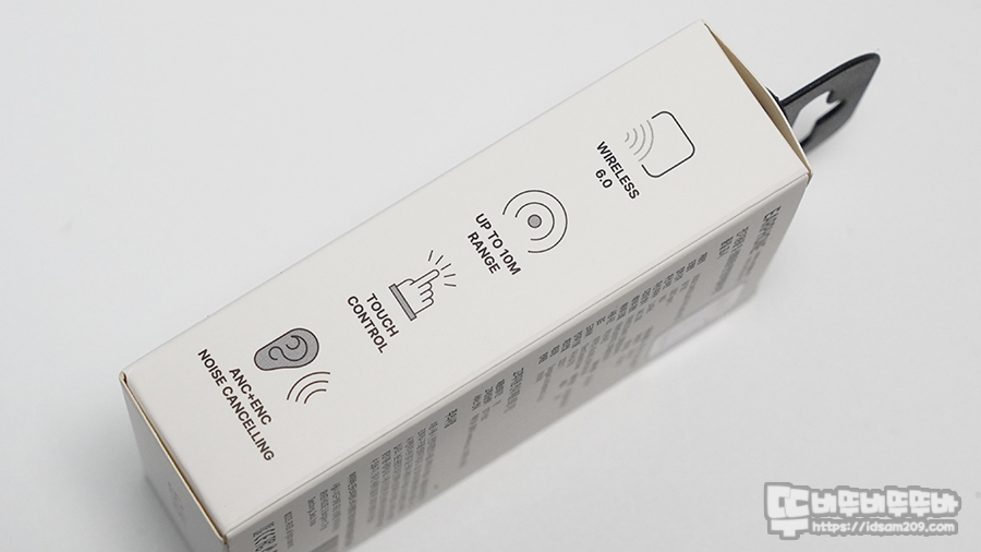 측면에는 블루투스 6.0, 10m 범위 작동 가능, 터치 컨트롤, ANC+ENC 노이즈 캔슬링 지원을 강조하고 있네요.