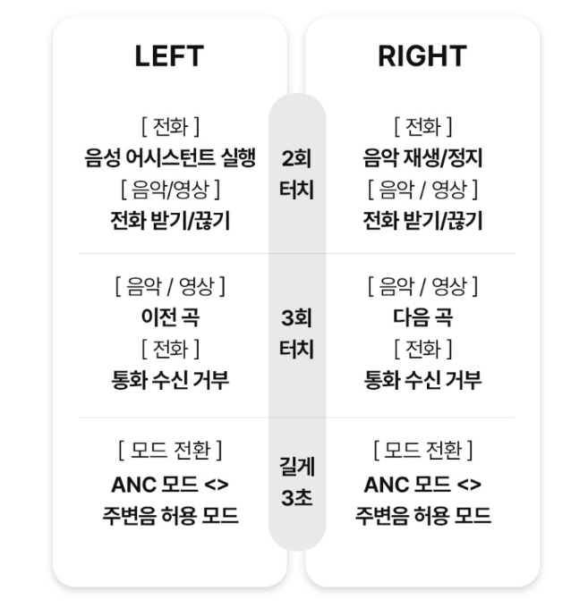 터치를 1회 시 왼쪽은 볼륨 적게, 오른쪽을 볼륨 크게 2회, 3회 시 위와 같이 다양한 기능 지원하며 3초간 길게  눌러 노이즈 캔슬링 On/Off, 주변음 듣기 모드를 한국어 음성 안내를 들으면서 작동하게 됩니다.