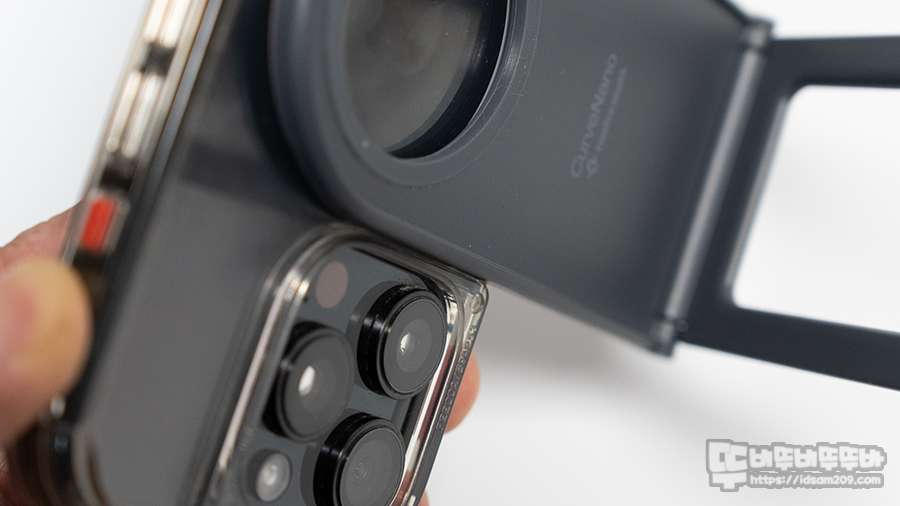 커브 나노 전면에는 원형 부분과 짧은 바 타입 실리콘이 적용되어 맥세이프로 스마트폰이 부착될 때 스크래치를 방지하고 있습니다.
