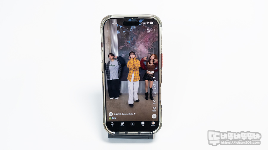 정보 보호 필름을 사용하고 있어 사선으로 화면이 잘 보이지 않지만 정면에서는 쇼츠 영상을 보기에 최적화된 뷰를 제공합니다.