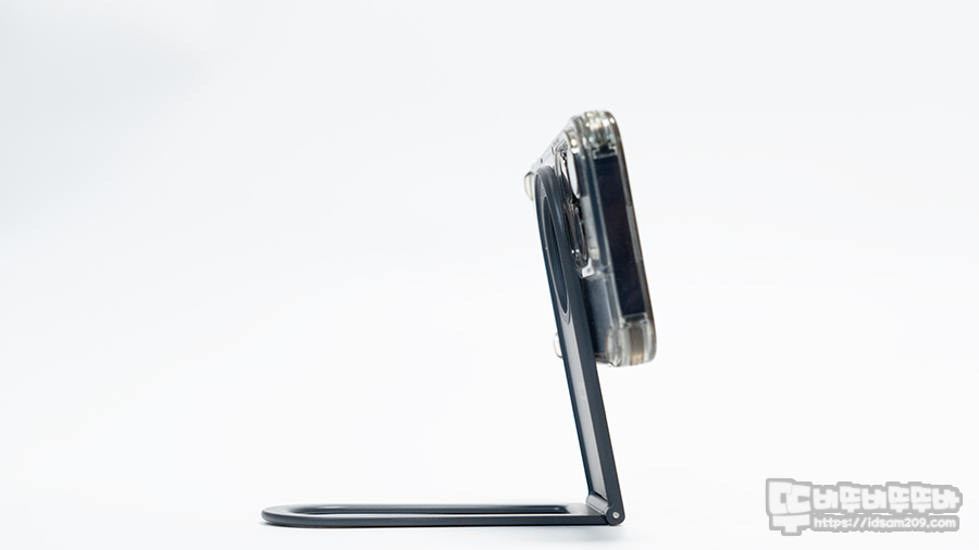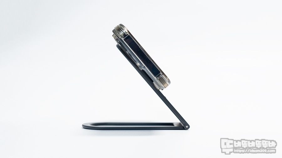 알루미늄 메탈 소재가 사용된 제품은 맥세이프가 거치면 안쪽은 ㄷ자 형태 디자인되어 다리 부분을 ㄷ자 형태에 틀에 약간 수납하는 형태로 슬림함을 유지합니다.