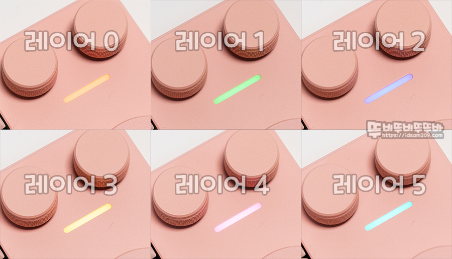먼저 제품의 기본 기능인 큰 노브를 푸시했을 때 레드 – 그린 – 블루 – 오렌지 – 퍼플 – 스카이 블루 순서로 레이어 0 ~ 5번까지 변경되는 부분을 숙지해야 편리하게 사용할 수 있으니 참고하세요.