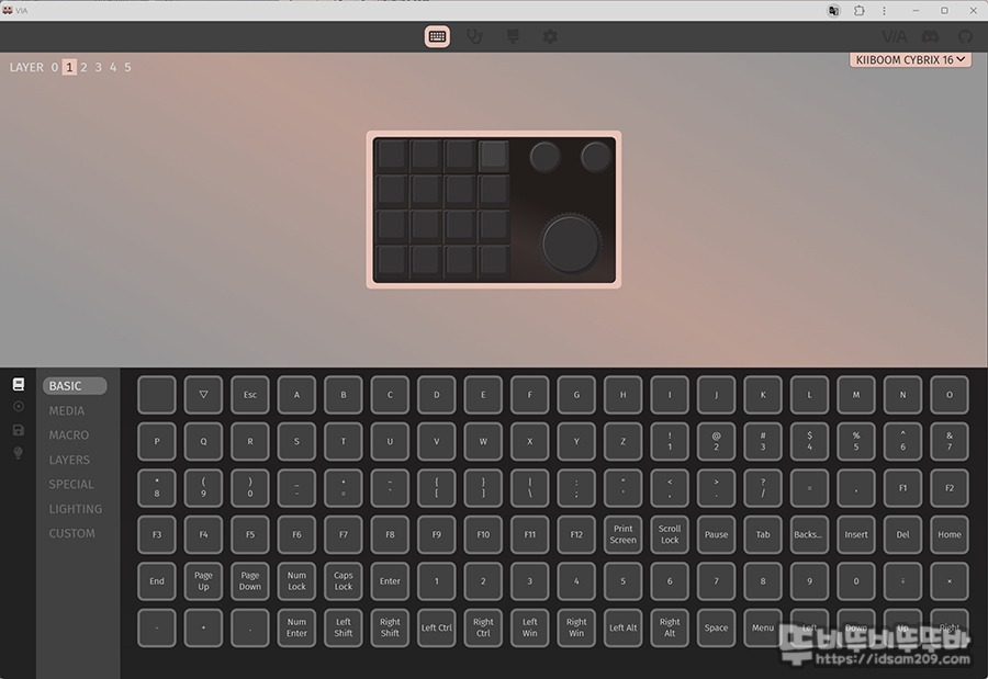키붐 매크로 편집 패드 CYBRIX 16은 전용 소프트웨어가 아닌 VIA 오픈 소스를 지원하기에 약간의 VIA 사용법에 대한 공부가 필요한데 아래의 내용을 참고하시고 시간을 투자하여 나만의 커스텀 설정을 연구해 보시기 바랍니다.