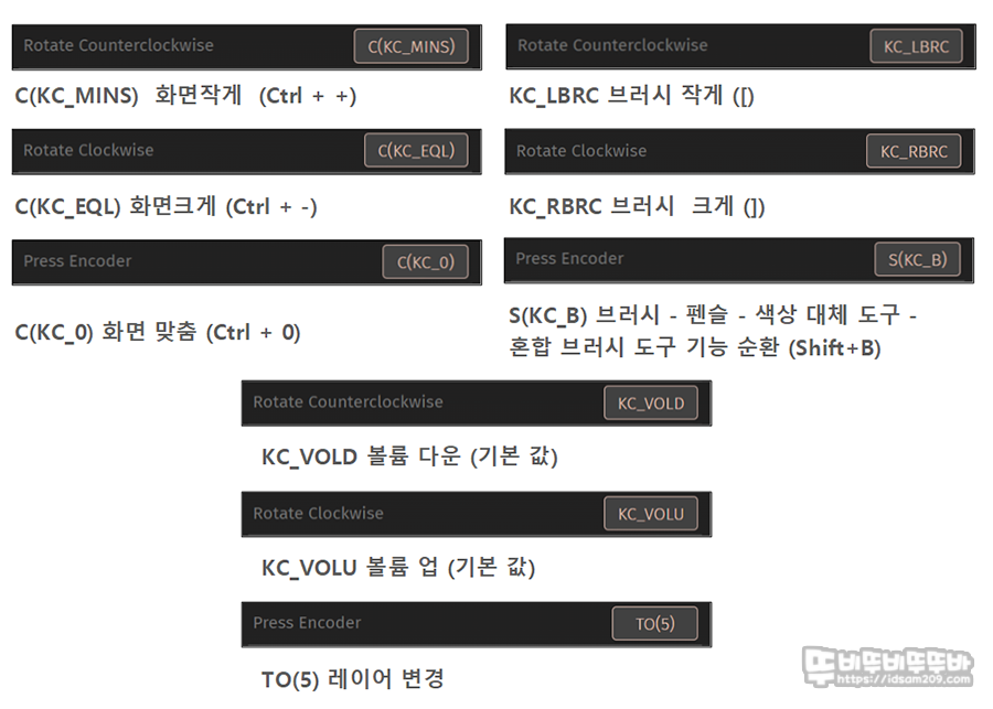 3개의 노브를 사용하기 위해서는 일반적인 키 기능 또는 매크로 기능이 아닌 키 코드를 이용하는 방식이기에 사실 가장 어려운 부분으로 제가 모든 기능을 설명드리지 못하니 내용을 참고하시고 응용하시는데 도움이 되기 바랍니다.