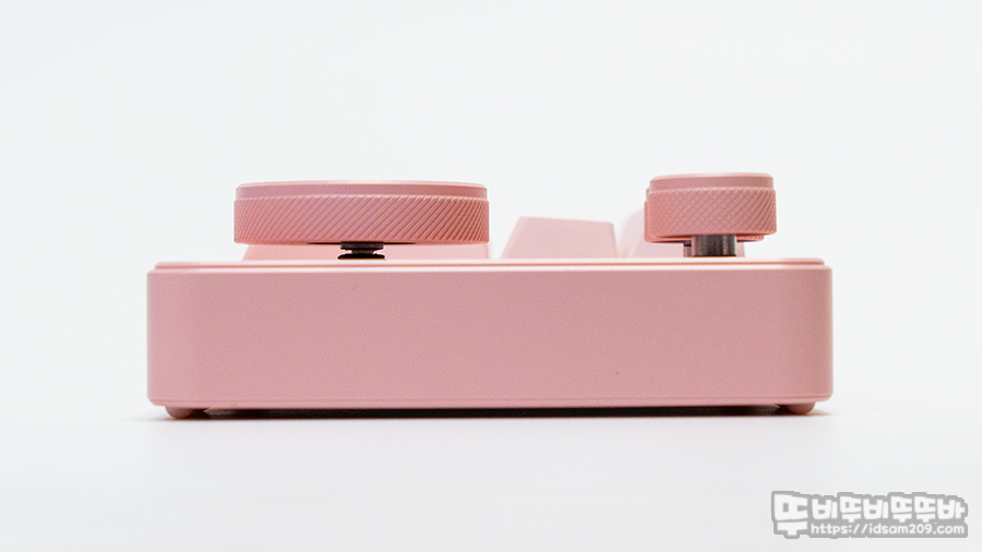 푸시 기능과 좌우 회전을 로터리 인코더가 적용된 노브는 기계식 키보드 청축 느낌의 구분감 있는 회전을 작은 사이즈 2개와 저소음 느낌의 구분감이 약한 큰 사이즈 1개로 구성되어 있습니다.