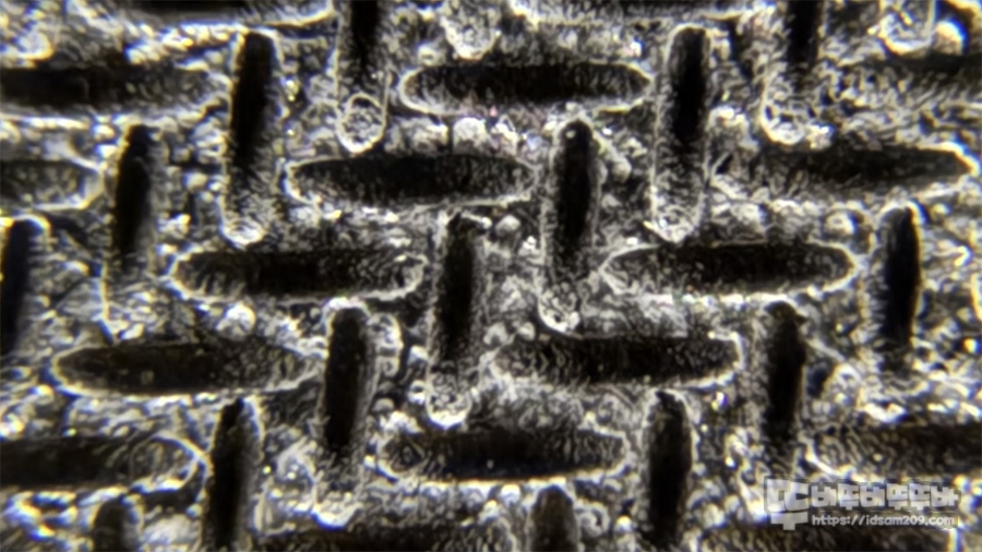 확대경으로 찍으면 아문젠 모직 모습을 살펴보면, X / Y 방향으로 결이 없는 구조라 마우스 사용 시 상하/좌우 방향 전환 또는 원형으로 드래그 시 마우스 이동의 감도 변화가 느껴지지 않습니다.
