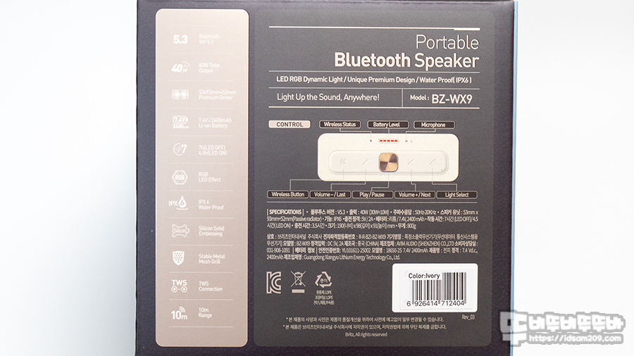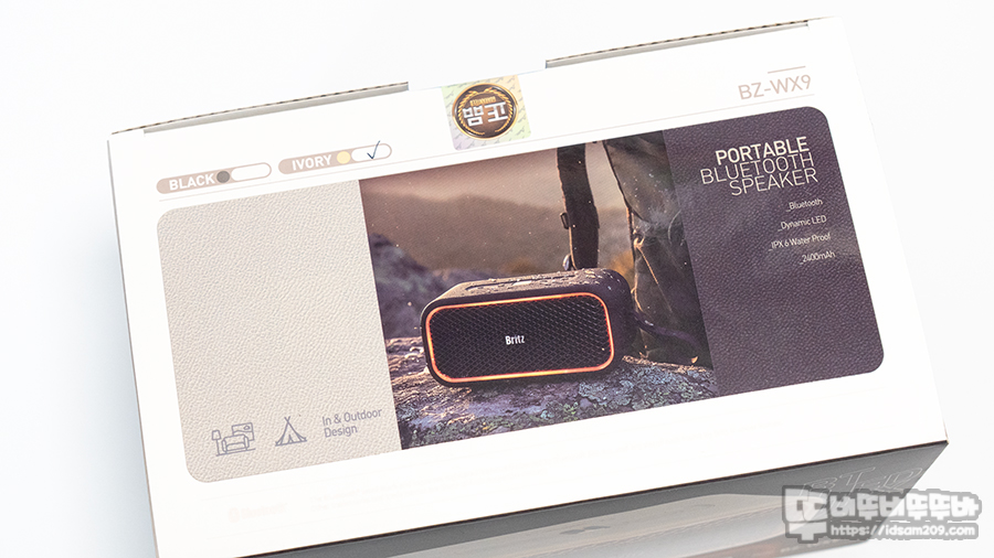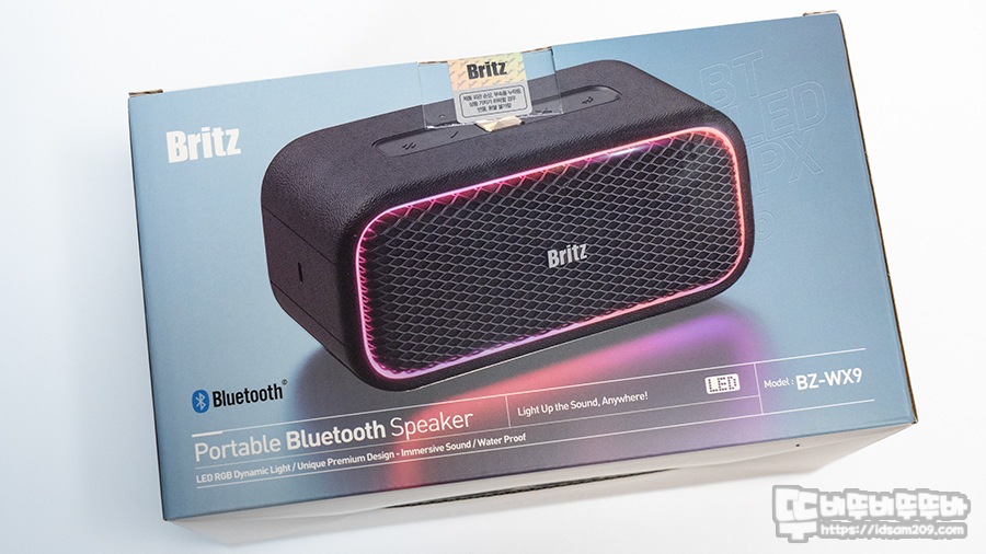 BZ-WX9 패키지는 LED 라이팅이 멋지게 들어오는 제품 이미지와 모델명, 포터블 블루투스 스피커를 명칭으로 제품의 아이덴티티를 잘 표현해 주고 있습니다.