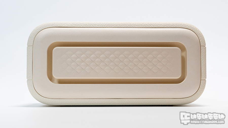 이전에는 대부분 스피커 외부를 인조가죽으로 마감한 제품이 대부분이었지만, 2026년 신모델은 가죽 무늬 적용된 실리콘 소재와 전면에는 골드 컬러가 적용된 메탈 그릴 그리고 그릴 주변에 LED 라이팅을 담당하는 디퓨저 라인을 확인할 수 있습니다.
