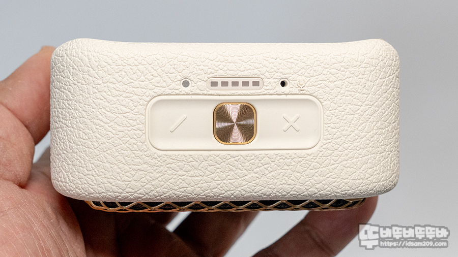 제품 상단에는 중앙에 전원 및 재생 일시 정지 버튼(골드 컬러) 기준으로 좌우로 볼륨/트랙, LED 효과, TWS 모드 버튼이 위치하고 있으며 그 위로는 왼쪽에는 작동 상태를 화이트 LED로 표현되는 LED 인디케이터, 다섯 칸으로 표현되는 배터리 잔량 LED 인디케이터 그리고 음성 통화를 위한 마이크가 내장되어 있습니다.