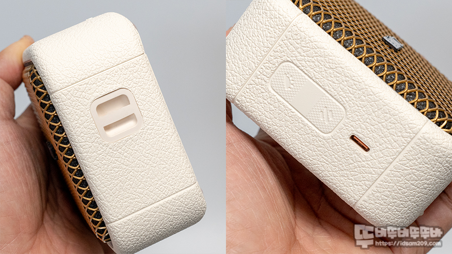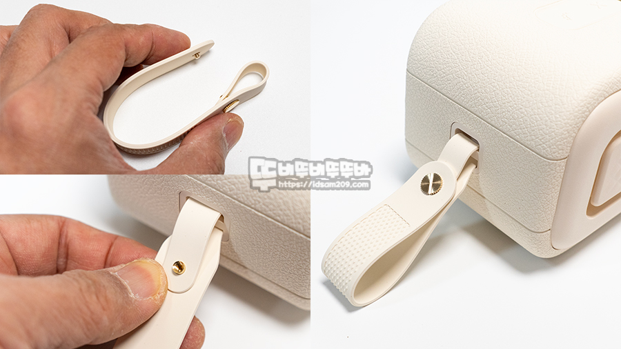 한쪽 측면에는 스트랩을 연결할 수 있는 고리를 확인할 수 있으며, 반대편에는 외부로 노출되는 USB-C 단자가 눈에 띄네요.