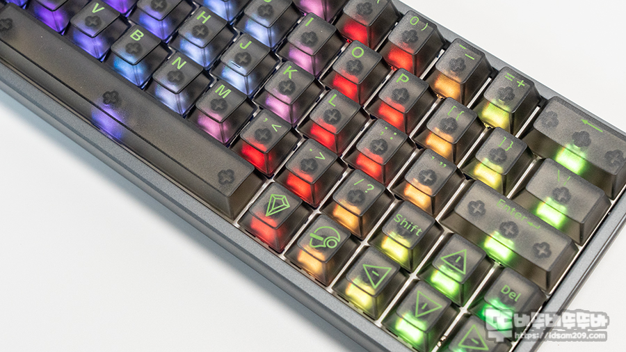 먼저 LED 광량이 매우 훌륭합니다. 스위치 내부의 디퓨저와 반투명 키캡의 시너지가 좋아 화려하고 선명한 조명 효과를 체감할 수 있습니다.