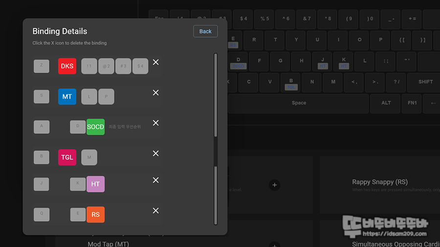 한글 번역이 조금 이상하긴 한데 자판 배열 옆에 " 역선택 " 버튼을 누르면 설정된 기능에 대한 정보를 확인할 수 있으며, X 표시를 선택하면 기능 해제가 가능합니다.