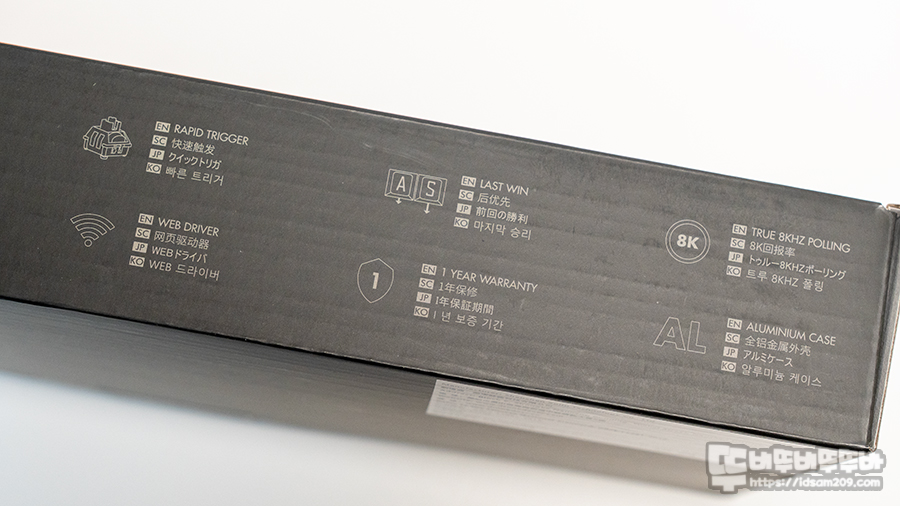 다른 면에는 제품의 특징으로 맞춤형 홀 효과 스위치(개별 설정을 이야기하는 듯), 자체 개발한 홀 직접회로, DKS 기능, RGB 조명 효과, 래피드 트리거, 라스트 윈, 8kHz 폴링레이트, 웹 드라이버, 1년 보증기간, 알루미늄 하우징 등의 내용을 다양한 국가 언어로 표현하고 있습니다.
