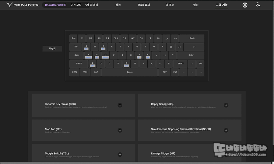 자. 그럼 DrunkDeer X60HE의 키 리매핑 / 성능 / RGB 효과 / 매크로 / 설정 / 고급 기능 그리고 환경 설정으로 구성된 메뉴를 하나하나 살펴보겠습니다.
