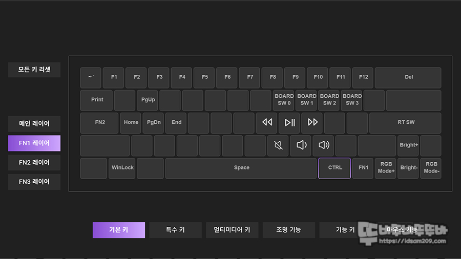먼저 " 키 리매핑 " 메뉴를 살펴보면 기본 레이어와 Fn 조합 키가 저장된 Fn1 레이어, 리셋 기능이 저장된 Fn2 레이어, 그리고 아무런 설정이 없는 Fn3 레이어 모습을 확인할 수 있고요.