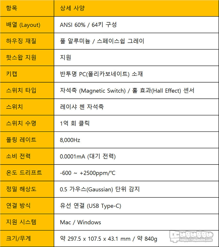 스펙 정보를 살펴보면 60% 배열(64키), 알루미늄 하우징, 반투명 PC 소재 키캡, 레이샤 QIAN 스위치, 8kHz 폴링레이트를 지원하는 것을 확인할 수 있습니다.