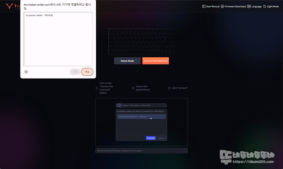 드렁크디어 사이트를 통해 웹 드라이브를 실행하면 키보드 인식과 함께 모델을 선택하는 메뉴를 마주하게 됩니다.