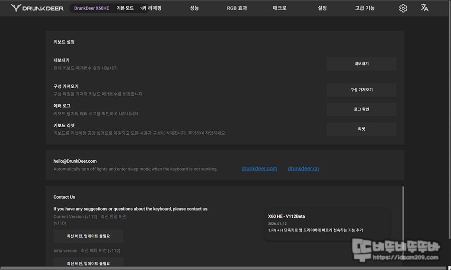 마지막 톱니바퀴 모양의 " 환경설정 " 메뉴를 선택 시 프로파일 내보내기, 불러오기, 리셋 기능과 펌웨어 정보를 확인할 수 있는데, v112 베타버전으로 펌웨어 시 Fn + H 단축키로 웹 드라이버 즉시 호출이 가능하니 참고하시기 바랍니다.