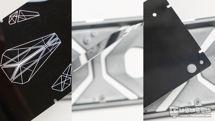 스모키한 느낌의 반투명 폴리카보네이트(PC) 소재를 사용하여 LED 라이팅이 은은하게 투영되어 시각적인 만족감이 높으며, 소재 특성상 표면이 다소 매끄럽고 빛 반사가 있을 경우 각인 시인성이 떨어질 수 있고요.