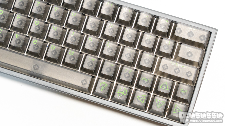 레이샤 첸 스위치와 보강판 부착용 체리방식의 스태빌라이저 모습을 확인할 수 있으며, PC 소재 반투명 키캡은 안쪽은 반짝이는 유광, 타이핑하는 위쪽 면은 표면 처리가 되어 스모그 느낌을 줍니다.