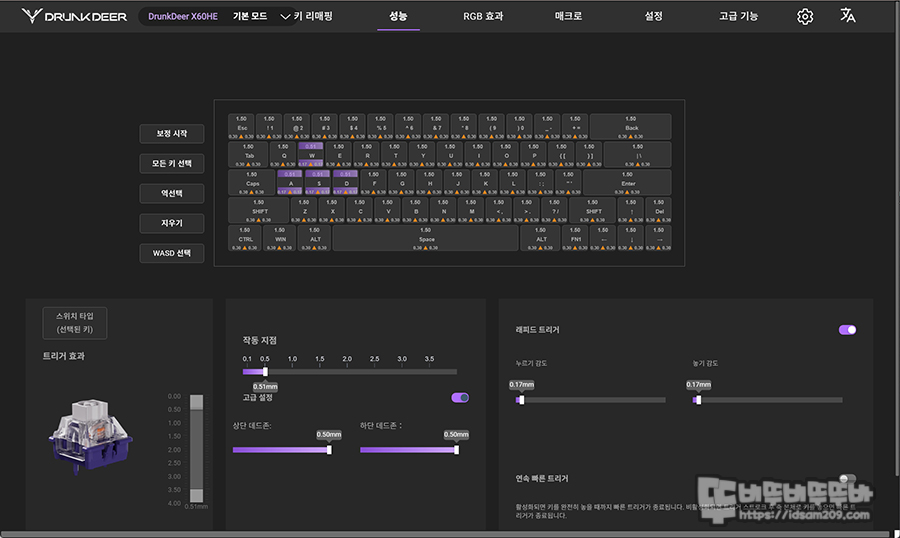 " 성능 " 메뉴에서는 작동 지점 설정, 상/하단 데드존, 래피드트리거 설정이 가능하며, 전체 키, WASD 키 등 상용자가 선택한 키에 적용이 가능한데요.