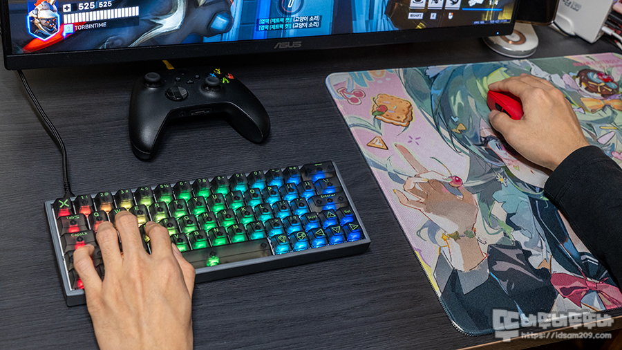 타건감 면에서는 일반적인 자석축 특유의 가벼운 느낌이 아닌 알루미늄 하우징과 탄탄한 흡음 구조 덕분에 잡소리가 억제된 정갈하고 단단한 타건음이 매력적입니다.