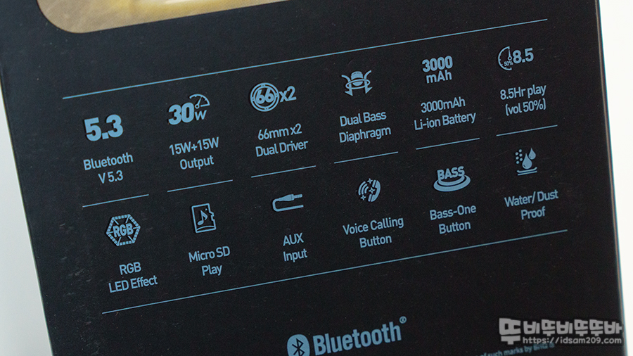 제품의 포인트 특징으로는 블루투스 5.3 탑재, 15W 출력 66mm 드라이버 2개 (총 30W 출력), 듀얼 베이스 다이아프램 구조, 3,000mAh 배터리 내장, 8.5시간(볼륨 50%)재생, RGB LED 효과, MicroSD를 이용한 MP3 플레이어, AUX 입력, 전화 통화기능, Bass 강화 버튼, 생활방수 기능 등을 표현하고 있습니다.