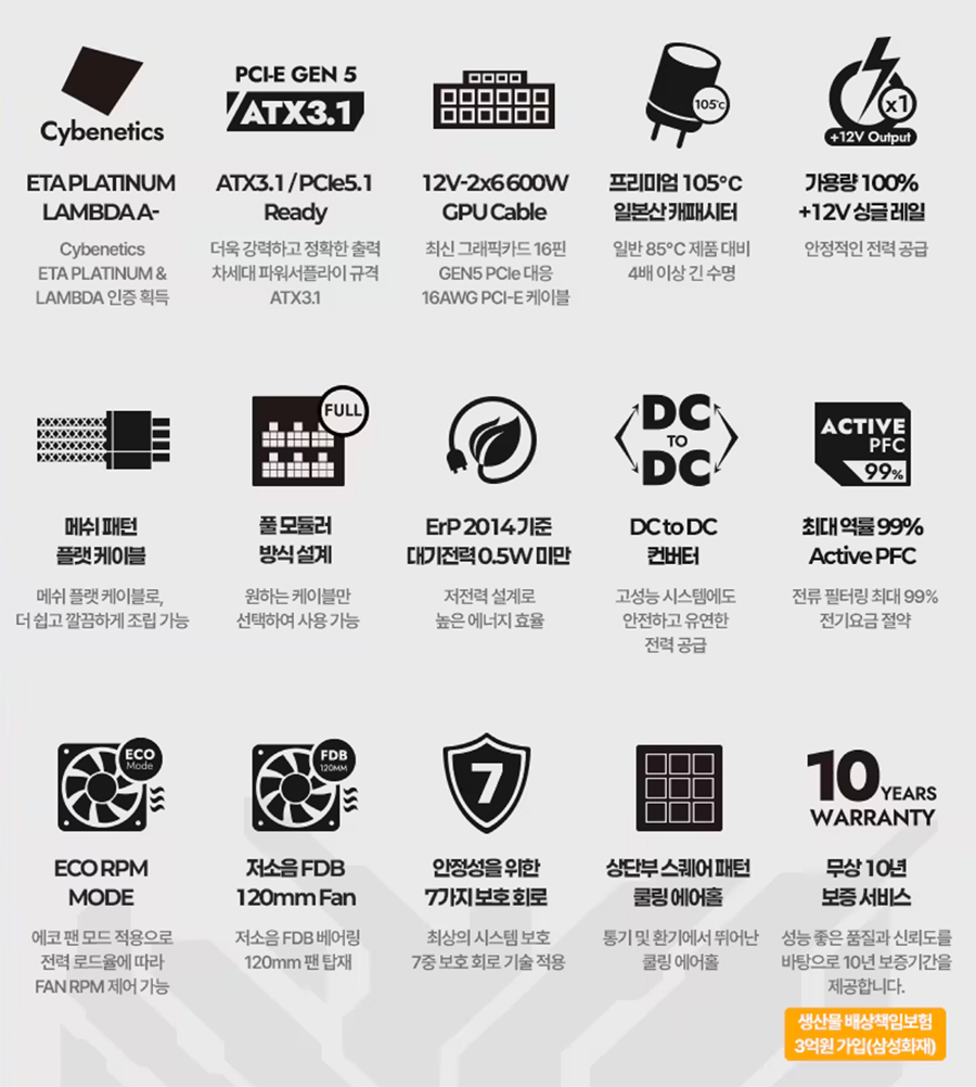 - ATX 3.1 규격: 차세대 파워서플라이 규격인 ATX 3.1 및 PCIe 5.1을 지원.