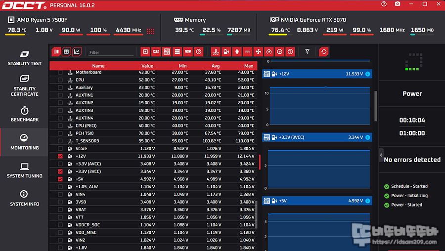 OCCT 10분 테스트와 AIDA64 시스템 안정화 테스트 30분 정도 테스트를 해보았을 때 짧은 시간이지만 특별하게 문제 되는 부분은 찾을 수 없었습니다.
