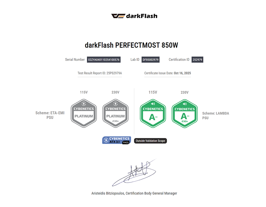 - Cybenetics 인증: ETA PLATINUM 및 LAMBDA A- 인증을 획득하여 높은 효율과 정숙성을 검증받음.