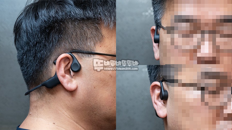 실제 착용해 보니 진동 유닛이 관자놀이에 안정적으로 밀착되며, 특히 안경 사용자임에도 간섭이나 눌림 현상 없이 편안한 피팅감을 경험할 수 있었습니다.