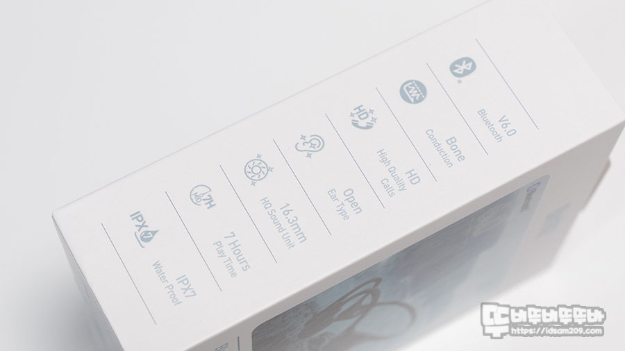 측면에 인쇄된 포인트 특징을 살펴보면 블루투스 6.0, 골전도 방식, HD 고음질 전화 통화, 오픈이어 방식, 16.3mm HQ 사운드 유닛 7시간 재생, IPX7 생활방수 지원 등이 강조되고 있고요.