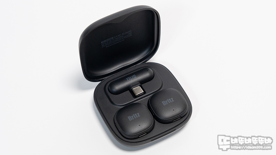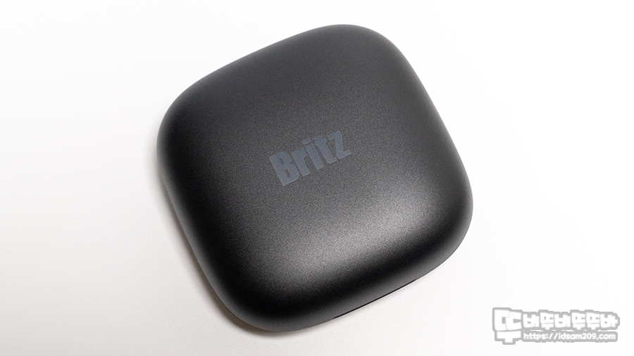충전 케이스는 플라스틱 소재를 사용하고 있으며 케이스 뚜껑 부분에는 Britz 로고가 있어 위/아래를 구분되며, 전면 아랫부분에 배터리 상태를 표현하는 LED 인디케이터 모습을 확인할 수 있습니다.