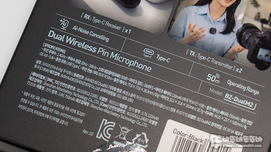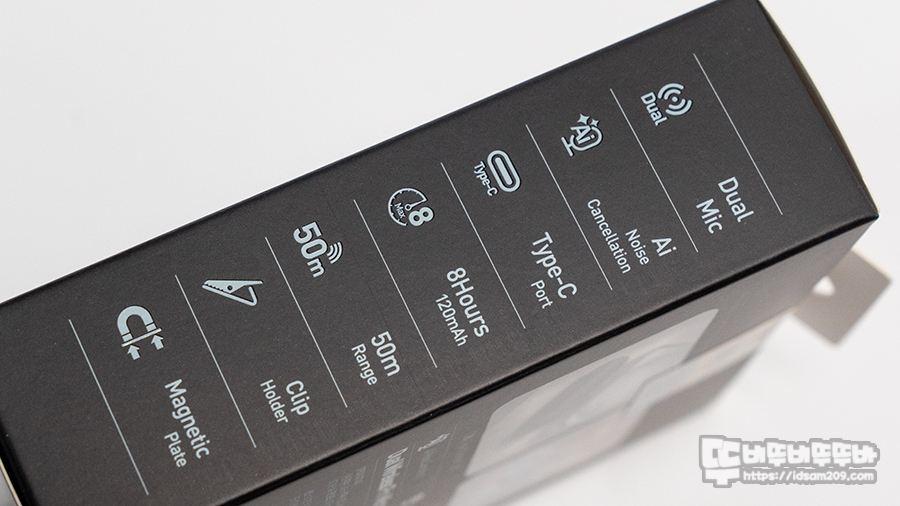 측면에는 제품의 포인트 정보인 듀얼 마이크, AI 노이즈 캔슬링, USB-C 방식, 8시간 사용(120mAh 배터리 내장), 50m 작동반경, 자석 클립홀더, 마그네틱 플레이트를 확인할 수 있습니다.